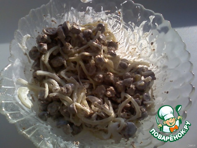 Добавляем лук! Я изначально вымочила в воде с уксусом (как бы вымариновала), чтобы не горчил лук, и тогда у салатика будет немножко кисловатый вкус, ну, это на любителя!