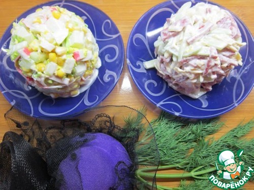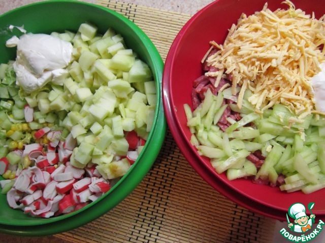 Соединяем ингредиенты салатов, заправляем майонезом.