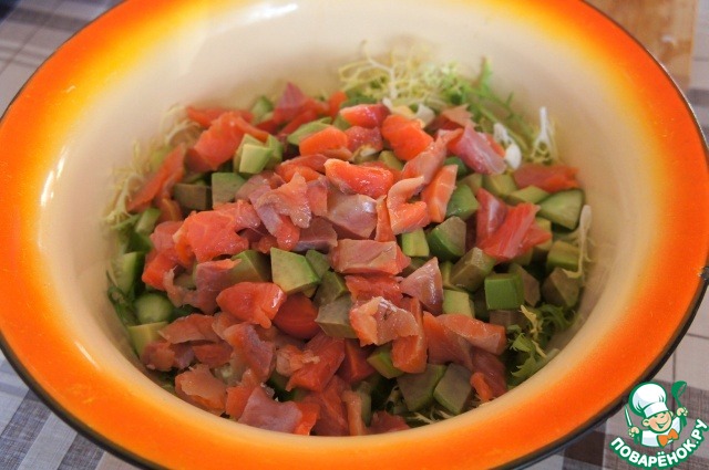 Авокадо очистить, удалить косточку. 1.5 штуки нарезать кубиками, полить лимонным соком и перемешать.