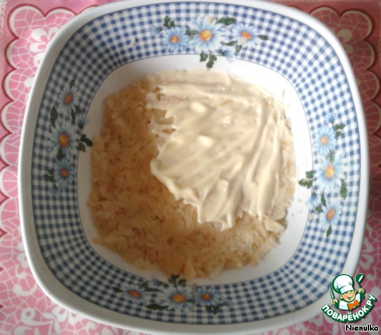 Салат укладываем слоями. Первый слой - натереть 2 картофелины на крупной терке. Смазать майонезом.
