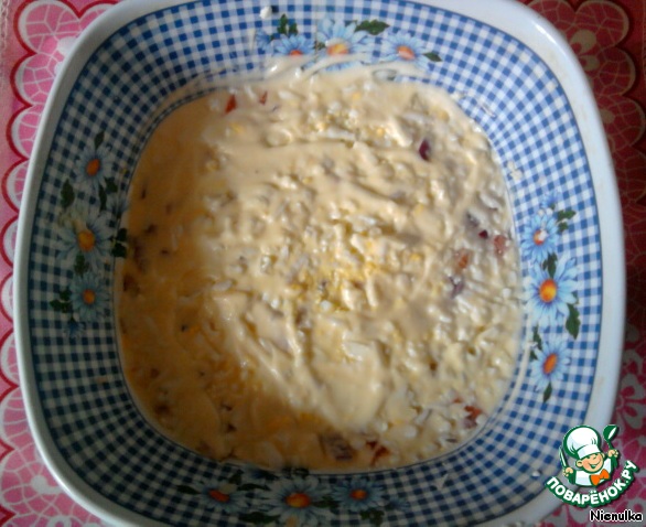 Укладываем ещё один слой картофеля и смазываем майонезом.