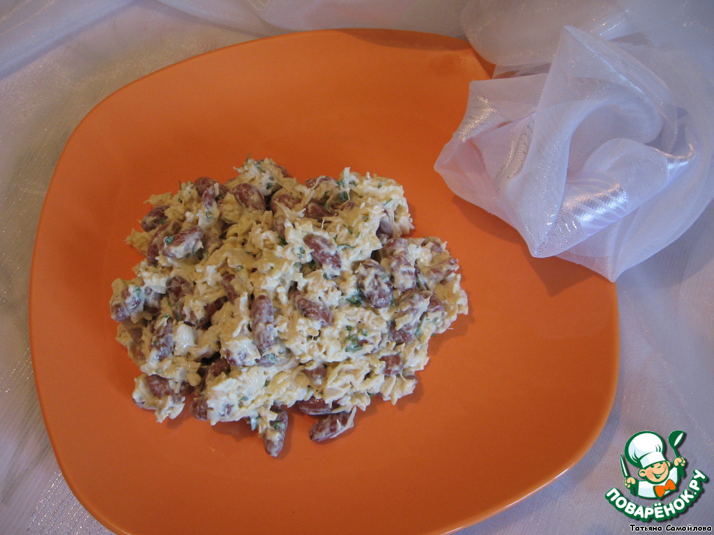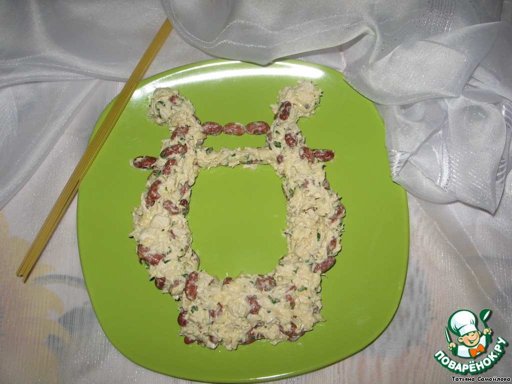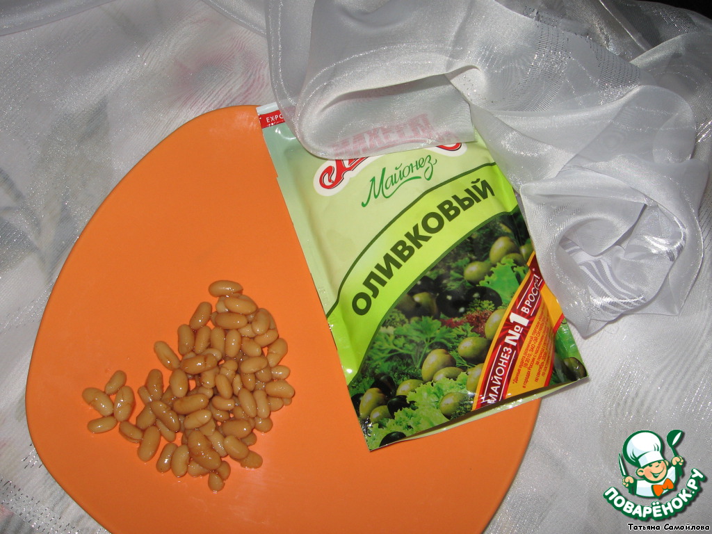 Немного белой фасоли измельчаем и смешиваем с майонезом. Покрываем салат