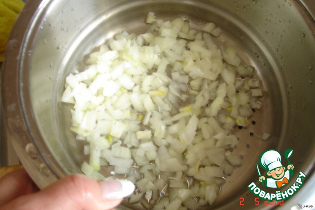 Лук мелко нарезать и замариновать (можно залить кипятком, чтоб ушла горечь).