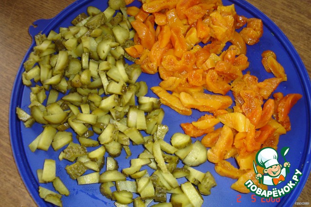 курагу и огурчики нарезать соломкой.