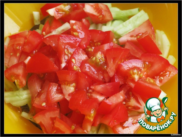 Помидор нарезать кубиками или произвольно, как пожелает душа.