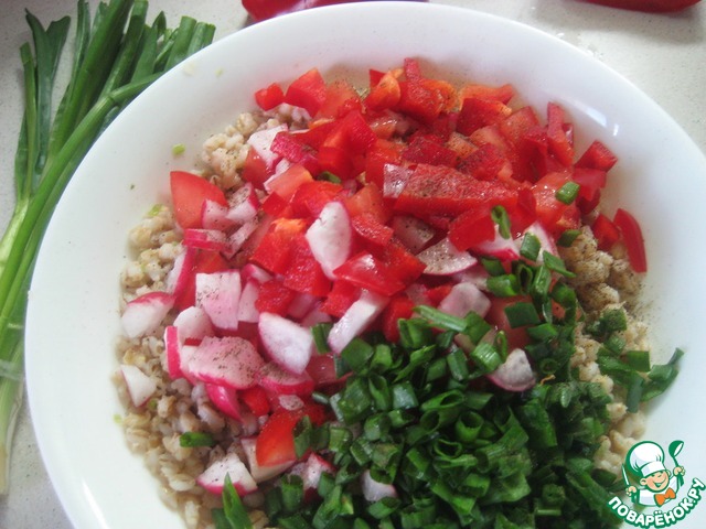 Теперь нарезаем редиску, болгарский перец, помидор - всё кубиками приблизительно одинакового размера, зеленый лук. Добавляем всю эту красоту к перловке и перемешиваем.