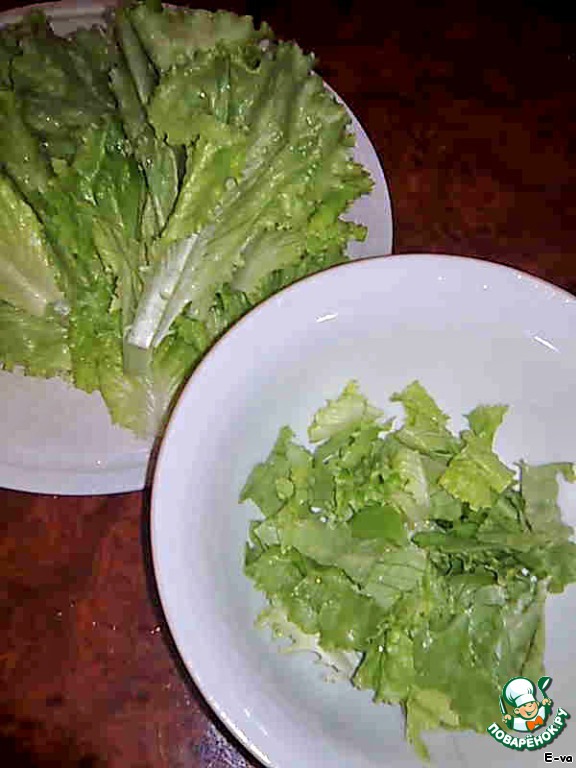 Листья салата помыть и руками порвать на кусочки (мельчить не нужно). Именно в этом салате лучше не шинковать, а именно нарвать листья.