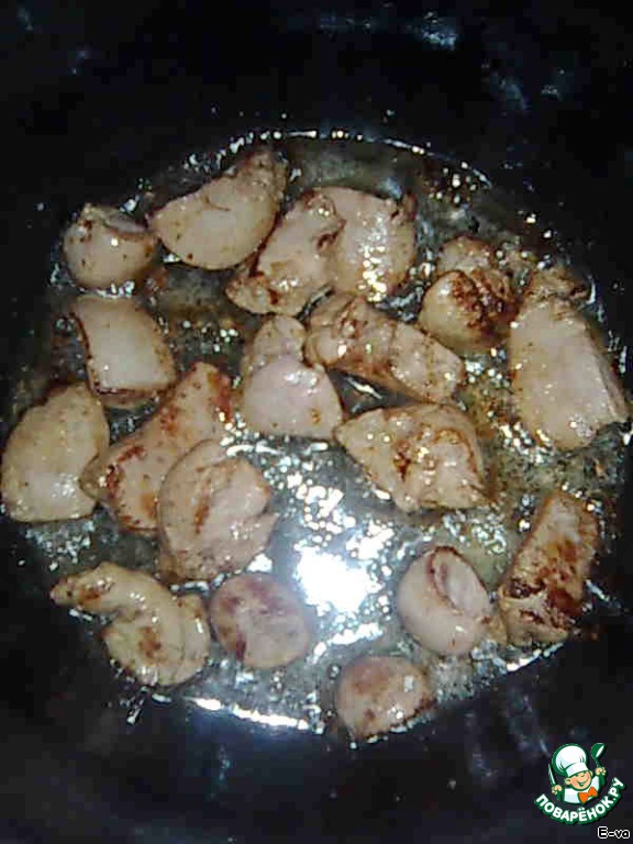 Печень кролика (наверное, можно и куриную) нарезать на небольшие кусочки, обжарить на сливочном масле минут 10.