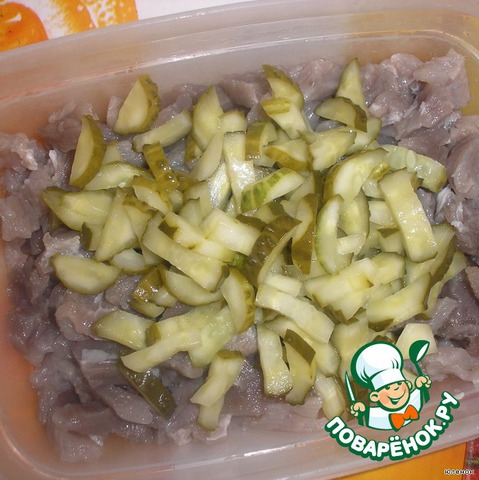 Порезать маринованные огурцы соломкой.