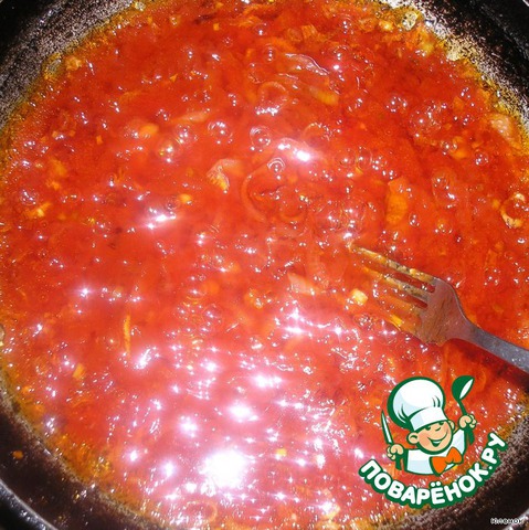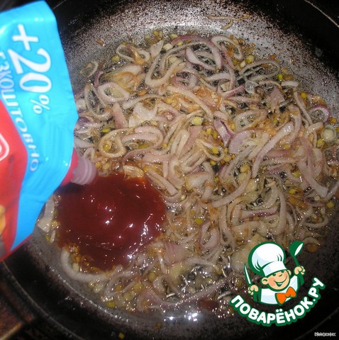 Добавить к луку упаковку кетчупа (добавляю "Лагідний", но если нужно чтобы блюдо получилось очень острым можно добавить "Чили").
