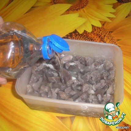 Замочить в уксусе на 12 часов. Удобнее замачивать на ночь. Уксус можно периодически доливать, чтобы мясо было покрыто им полностью.