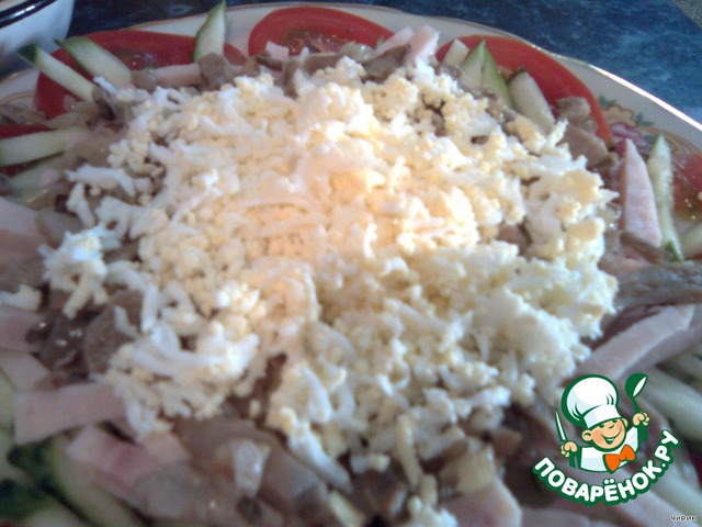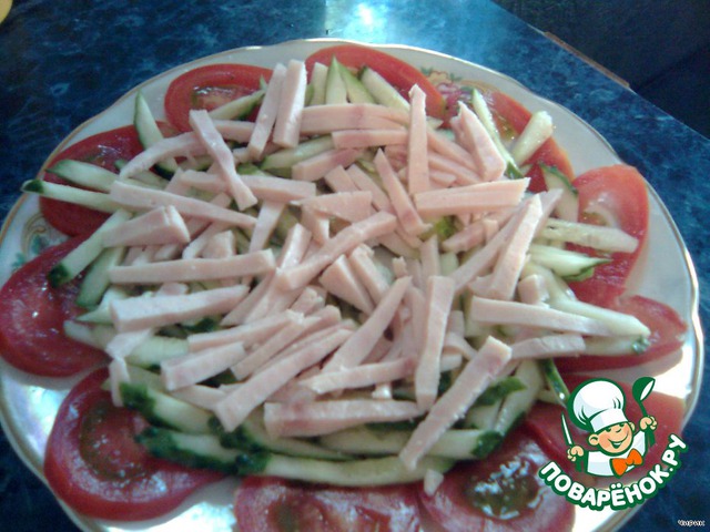 Выложить на тарелку сначала помидоры, потом огурцы и ветчину