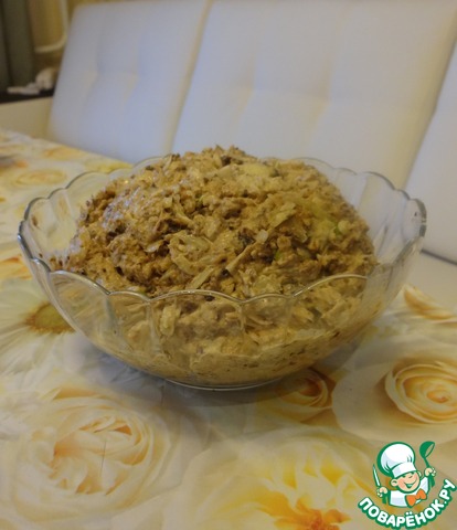 Смешиваем рыбу, чернослив, грецкие орехи, яблоко, сыр и лук. Все тщательно перемешиваем. Это очень важно, иначе будет совсем не тот вкус!