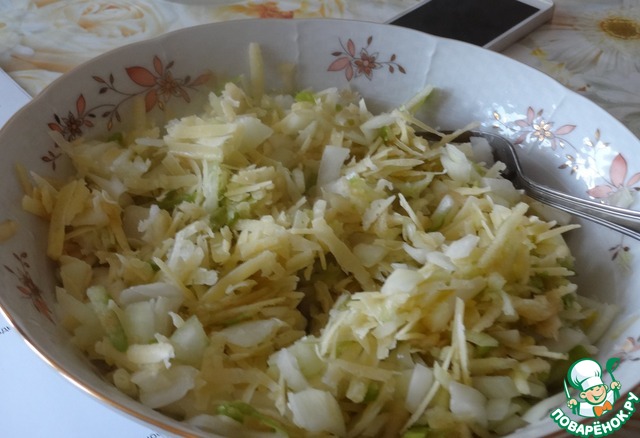 Натираем на крупной тёрке сыр и яблоко, мелко режем лук и все смешиваем. Спрыскиваем лимонным соком и перемешиваем.