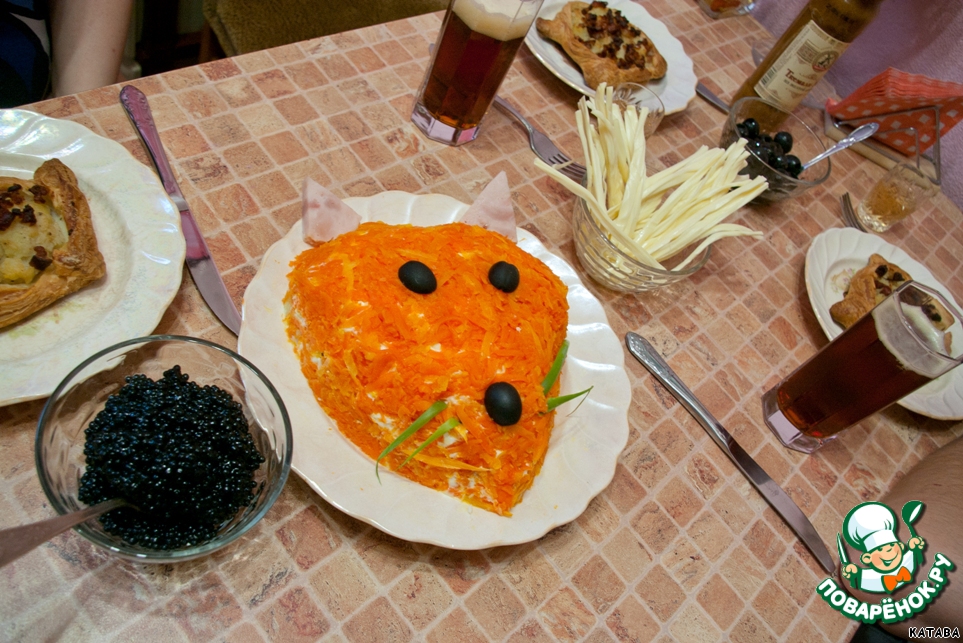 | Делала мужу на день рождение салатик. У мужа страсть к лисам. Вот и салат соответсвующий получился. Салат придуман случайно, вышел очень даже вкусный. |