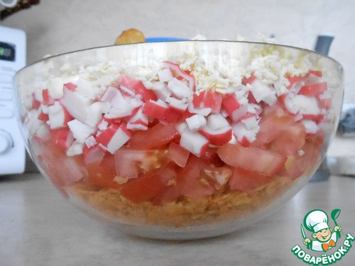 Третий слой - мелко рубленые крабовые палочки, опять же, чтобы был полностью равномерно покрыт предыдущий слой.
