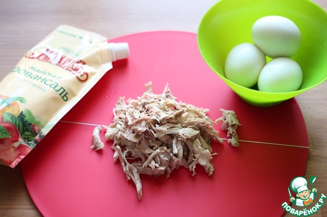 1. Куриное бедро приготовить на пару. Так оно получится идеальным, не сухое, не жирное. Разобрать на волокна. Яйца отварить вкрутую.