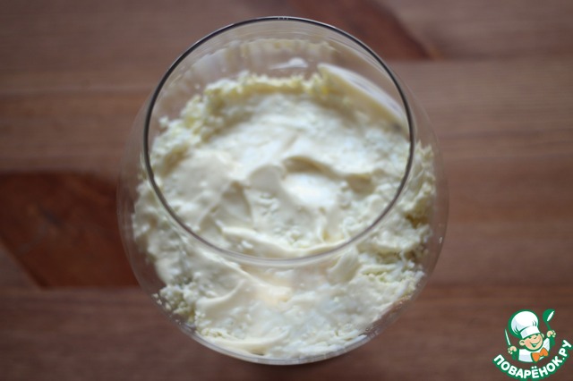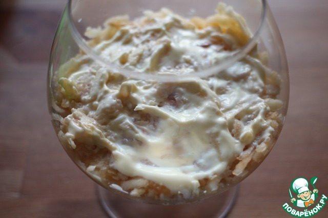 2. В красивый бокал, фужер... выложить слой куриного мяса, смазать майонезом.