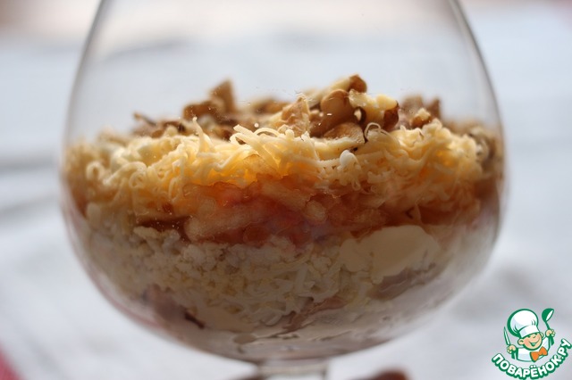 5. Последний слой, идеально сочетающийся с орехами - сыр. Сыр натереть на мелкой тёрке, выложить. Сыр слегка смочить водой, я делаю это рукой, майонез ляжет очень легко. Смазать майонезом.