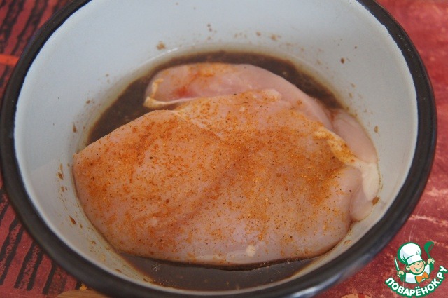 Положить мясо в маринад и хорошенько его искупать в нем. Оставить курицу в маринаде на 20 минут.