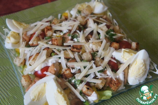 С белого хлеба отрезать корочки, нарезать небольшими кубиками, сбрызнуть слегка оливковым маслом и обжарить на сковороде до румяной корочки. Посыпать сухариками салат.