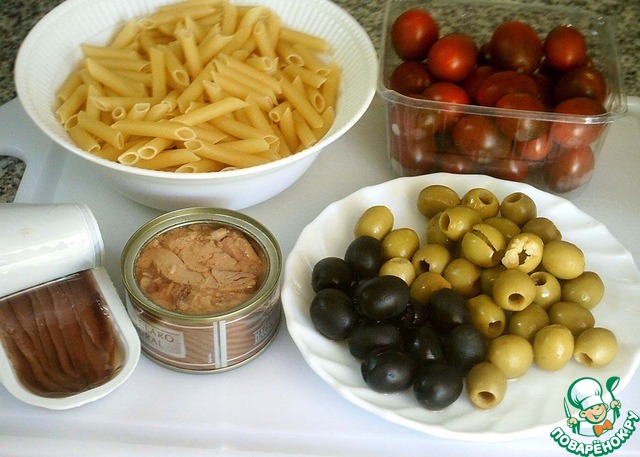 Слить воду с зеленых оливок и измельчить их с анчоусом, добавив немножко масла.