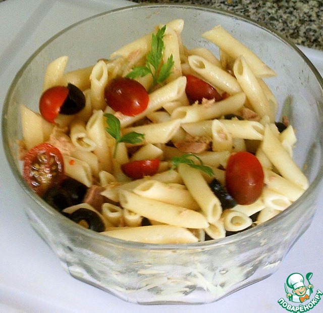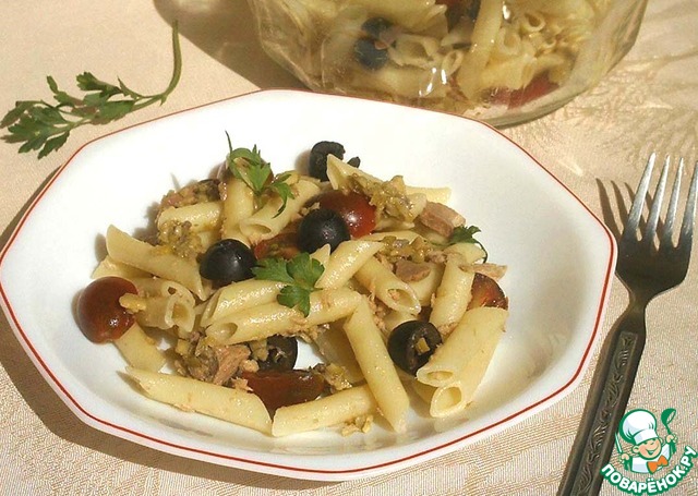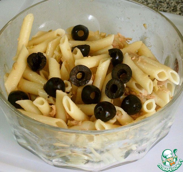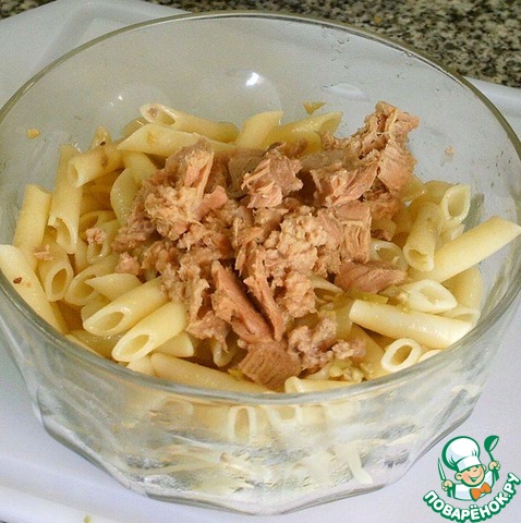 Затем слить масло из банки с тунцом, немного поломать на кусочки и добавить к пасте.