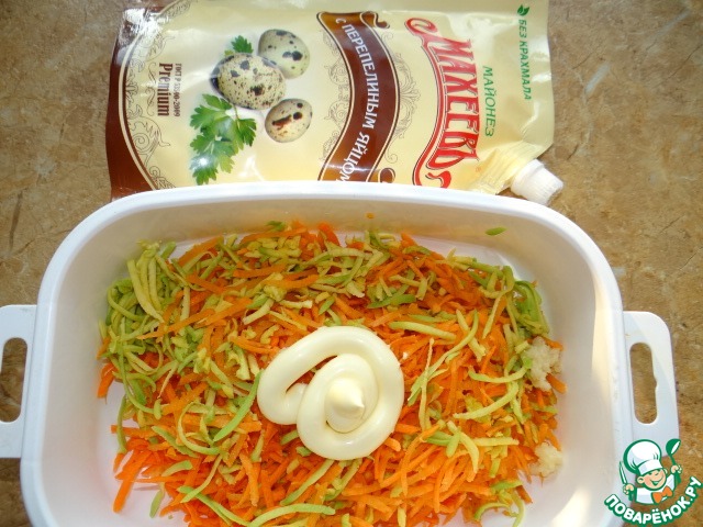 Добавить чеснок (через чеснокодавилку) соль по вкусу и майонез - размешать;
