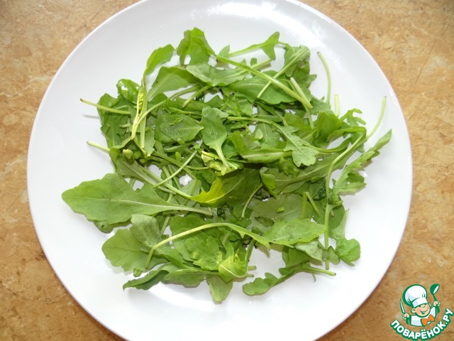 В салатную тарелку выложить любимую зелень (у меня рукола);