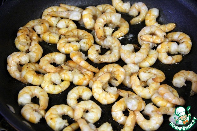 Креветки помыть, очистить и слегка обжарить с обоих сторон до розового цвета.