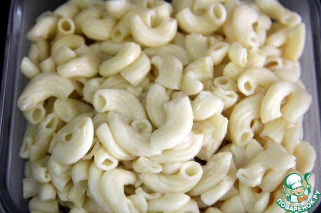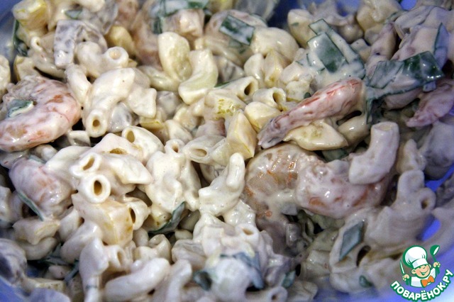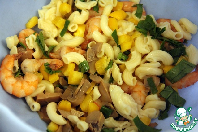 Смешать макароны, кревекти, нарезанные шпинат, перец и грибы.