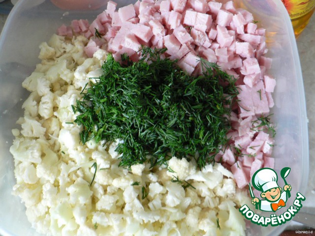 | Салат из сырой цветной капусты с ветчиной. Сделала впервые, но получилось очень вкусно. |