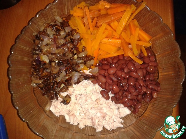 Складываем все ингредиенты в большую чашу, оставив немного фасоли и моркови для украшения. Добавляем майонез, тщательно перемешиваем.