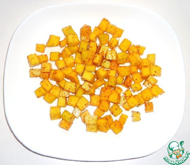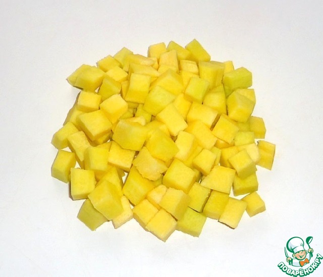 Тыкву очистить, удалить семена и нарезать кубиками.