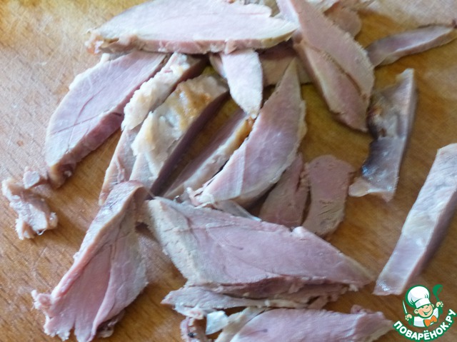 Нарезаем мясо, мясо может быть любым: говядина, грудки куриные, грудки индюшачьи, кролик