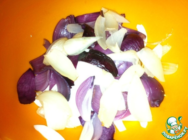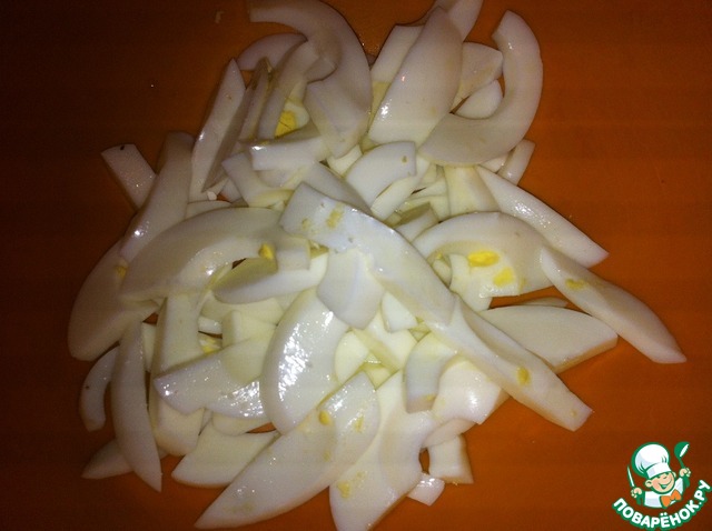 Готовый лук режем вдоль на 4-6 частей и разбираем на перья. Осторожно - горячий