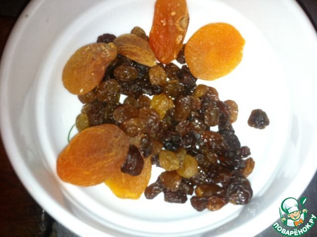 Заправляем. Изначально я хотел добавить мёд и дижонскую горчицу, но мёда не нашлось, отсюда и изюм с курагой для сладости