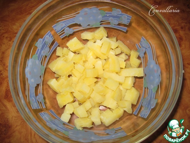 Картофель отварить в мундире, остудить, очистить и нарезать одинаковыми небольшими кубиками. Переложить в глубокий салатник.