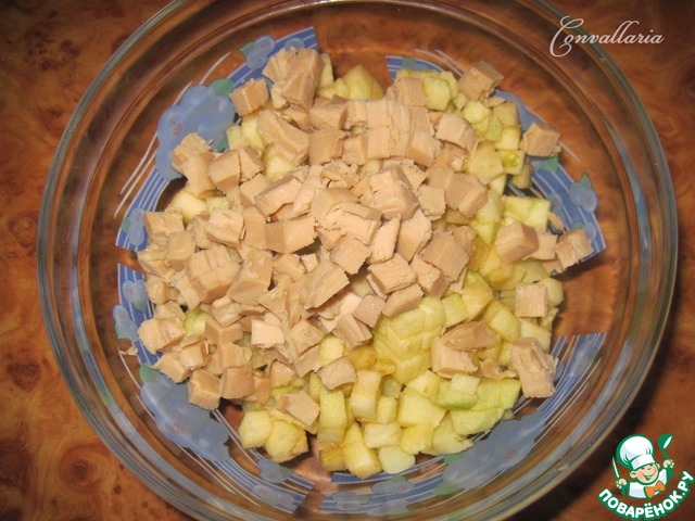 Мясо кальмаров вынуть из банки, хорошо промыть, обсушить и нарезать небольшими кубиками. Переложить в салатник.