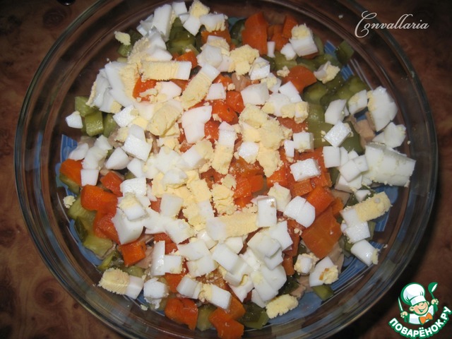 Яйцо, морковь и огурец также нарезать одинаковыми кубиками. Добавить к остальным ингредиентам.