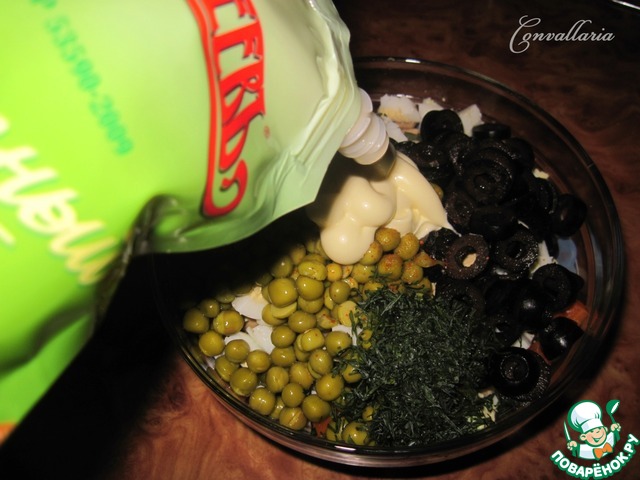 В салатник всыпать горошек и маслины, нарезанные колечками.