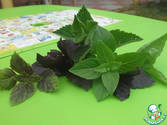 Базилик у меня четырех сортов (но это конечно не обязательно), один - с ванильным вкусом, другой - со вкусом корицы, два других фиолетовый и мраморный. Наличие такого базилика придает особый вкусовой оттенок блюдам, очень рекомендую!