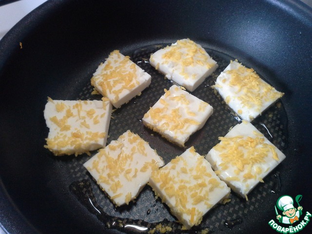 Сыр халуми или адыгейский режем на тонкие (3-4мм) ломтики, слегка обваливаем в японских панировочных хлопьях (если нет, то можно ни в чем не обваливать) и обжариваем в небольшом количестве оливкового масла до золотистой корочки. Выкладываем на бумажное полотенце, чтобы убрать лишнее масло.