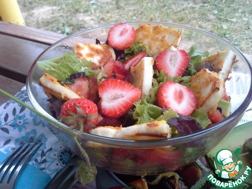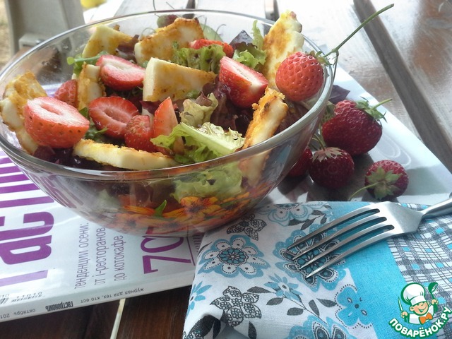 Салат со свежей клубникой, авокадо и жареным сыром халуми