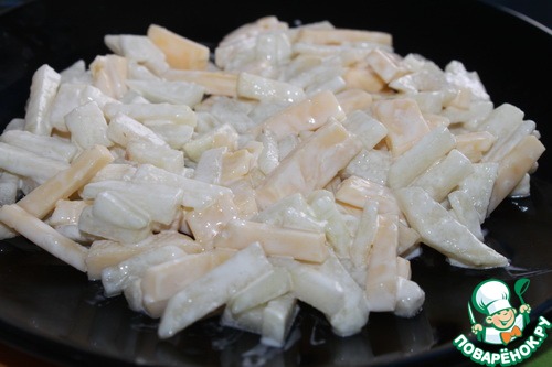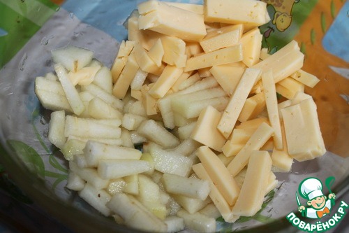 Груши очистить от шкурки, нарезать соломкой. Сыр также нарезать соломкой.