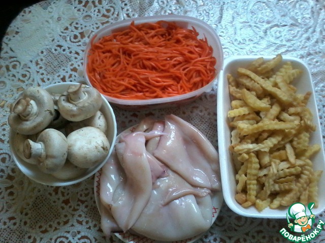 Кальмарчиков отвариваем, режем соломкой.