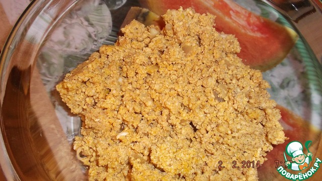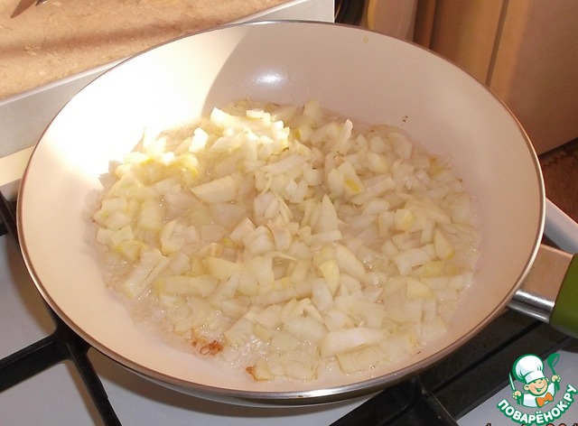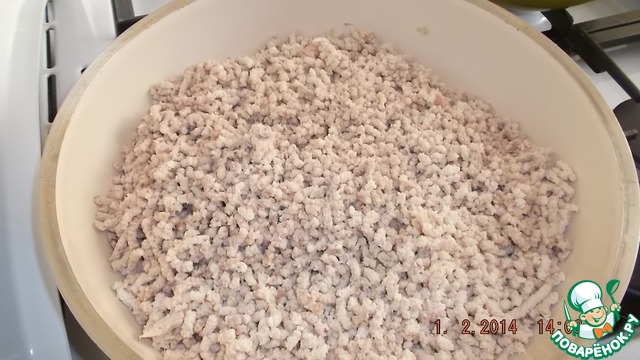 Вареное мясо прокручиваем в мясорубке и обжариваем на растительном масле. Добавляем в него приправы.