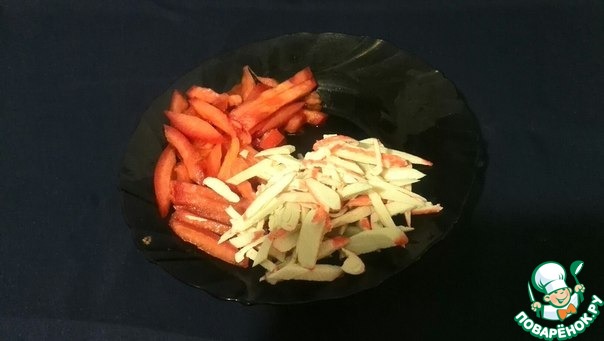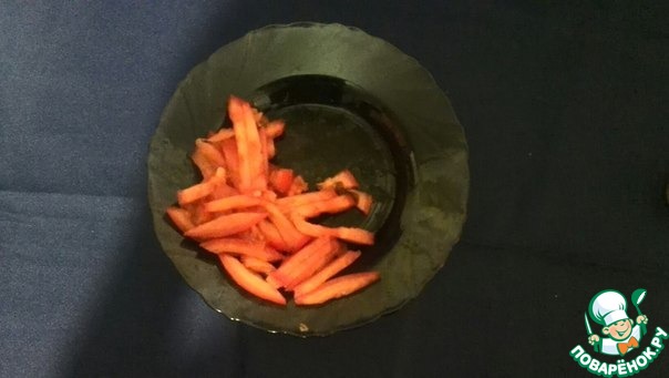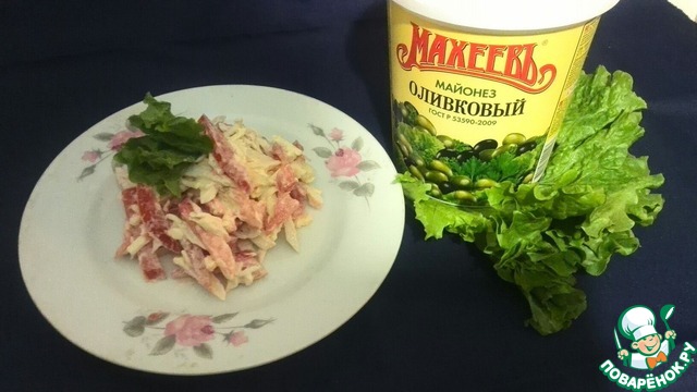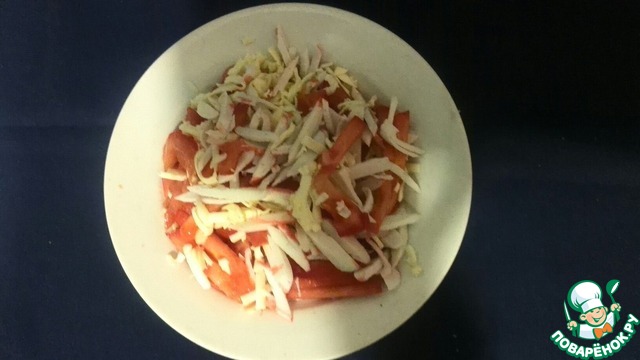 Тоже самое делаем с крабовыми палочками. Так же нарезаем их соломкой.