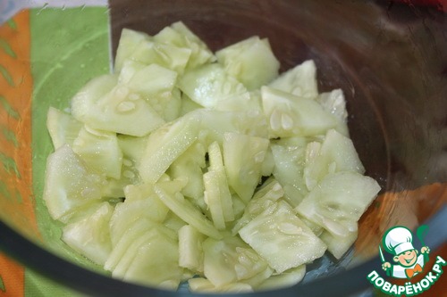 Огурцы нарезать тонкими кружочками, каждый кружок разрезать на 4 части.