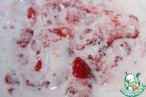 Оставшиеся ягоды клубники нарезать кубиками, соединить со сметаной, перемешать. Можно взбить блендером.